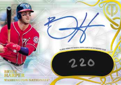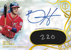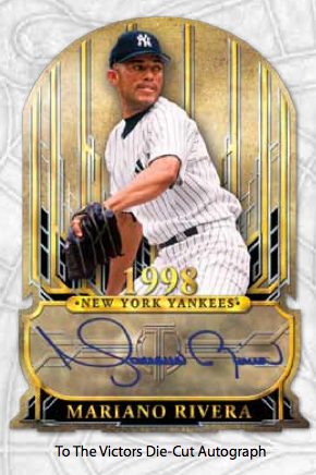 Also new are diecut To the Victors autos, which will showcase past World Series champs and be found one per case. These will have Gold (/15), Purple (/10) and 1/1 Red parallels, while Eccentric Eye Black autos once again return in small quantity — this time just five copies with a 1/1 Red parallel.