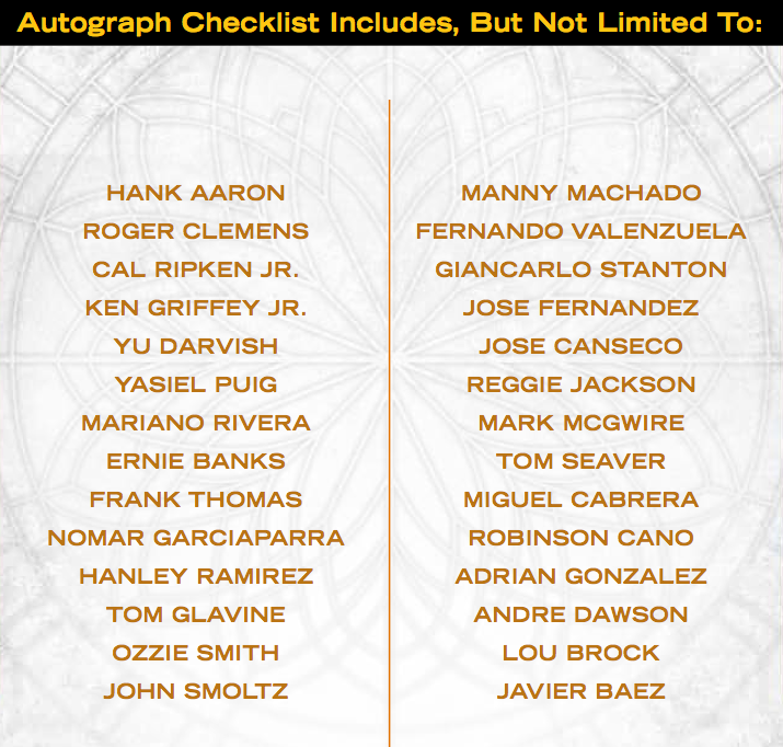 Some names teased as signers are Hank Aaron, Roger Clemens, Cal Ripken Jr., Ken Griffey Jr. Yu Darvish, Ernie Banks, Yasiel Puig, Mariano Rivera, Manny Machado, Jose Canseco, Mark McGwire, Javier Baez, Miguel Cabrera and Tom Seaver to name a few.