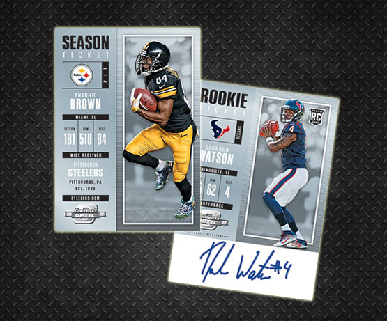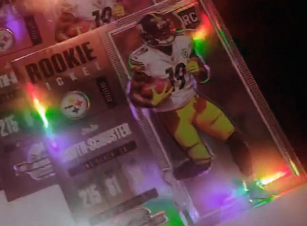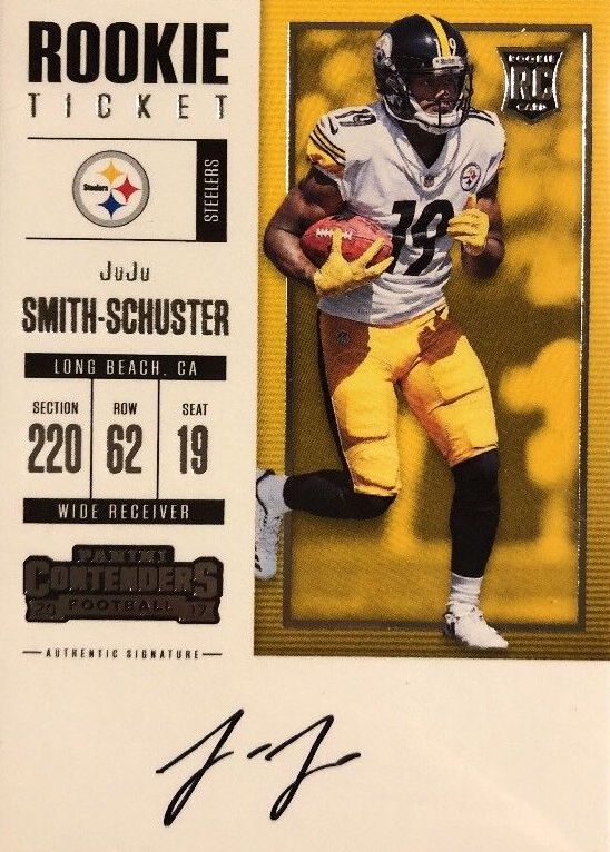 The card has the same general design as Smith-Schuster’s 2017 Panini Contenders Football Rookie Ticket Autograph, only done on chromium card stock.