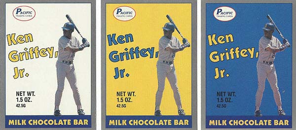 Designed to promote a Ken Griffey Jr. chocolate bar, Pacific’s first cards of the Hall of Famer come in three different versions. The only different between them is the background color: white, yellow and blue. In a bit of irony, Griffey is actually allergic to chocolate.