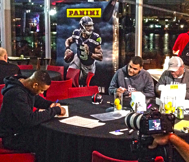 The Collegiate Bowl puts aspiring NFL rookies in front of team evaluators, giving them a chance to draw attention they may not otherwise receive. Among the 2014 rookies attending are Teddy Bridgewater, Mike Evans, Jordan Matthews, Tre Mason, Jarvis Landry, John Brown, Martavis Bryant, Bishop Sankey, Brandin Cooks and others. They signed several cards for the aforementioned upcoming products. Panini shared some photos with us (see below) and we were able to chat with Tampa Bay receiver Mike Evans about his incredible season, his Michael Jordan card collection that he lost, and his advice for upcoming rookies. Evans ranked second among rookie receivers with 1,051 yards. His 12 touchdowns tied Odell Beckham, Jr. for most among rookies.