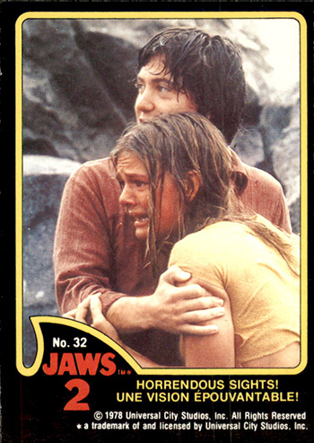 The card fronts depict a scene from the film surrounded by a yellow and black border. In the lower left corner is a fin indentation that contains the card number and the film title. The title of the card lies at the center bottom. Since this is O-Pee-Chee, you get the benefits of a bilingual title.