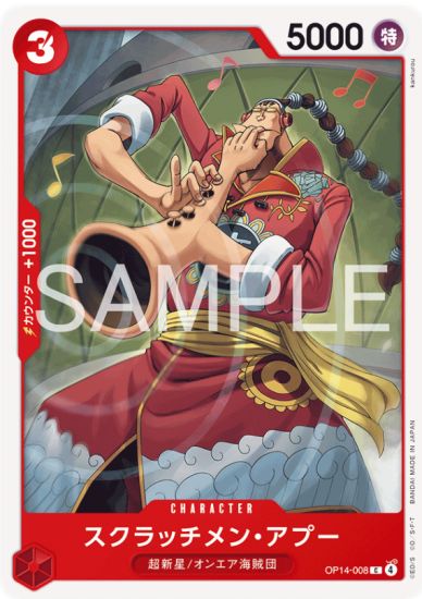 OP14-014 — Eustass “Captain” Kid OP14-015 — Roronoa Zoro OP14-023 — Kikunojo OP14-027 — Shanks OP14-029 — Tashigi OP14-042 — Arlong OP14-043 — Aladine OP14-047 — Shirahoshi OP14-058 — Ocean Current Shoulder Throw OP14-061 — Vergo OP14-063 — Sugar OP14-074 — Monet OP14-076 — Ever White OP14-087 — Miss Valentine (Mikita) OP14-090 — Mr. 1 (Daz Bonez) OP14-092 — Mr. 3 (Galdino) OP14-096 — Ground Death OP14-101 — Perospero OP14-103 — Black Maria OP14-107 — Tengu OP14-118 — You’ll Frighten Me… OP14-121 — Bartholomew Kuma OP14-124 — Oars OP14-128 — Blueno OP14-131 — Spandam OP14-133 — Lucci OP14-137 — Ice Hunter OP14-138 — Franky OP14-142 — Nico Robin OP14-146 — Marine Admiral OP14-148 — World Government OP14-150 — Revolutionary Army OP14-151 — Yonko Flag OP14-154 — Wave Crash OP14-156 — Legacy of the Sea