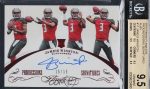 The cards in question are part of the New Generation Dual Jerseys insert set. More specifically, it’s a pair of Mirror Blue parallels. One has swatches from Jamies Winston and Rashad Greene, the other Amari Cooper and T.J. Yeldon.