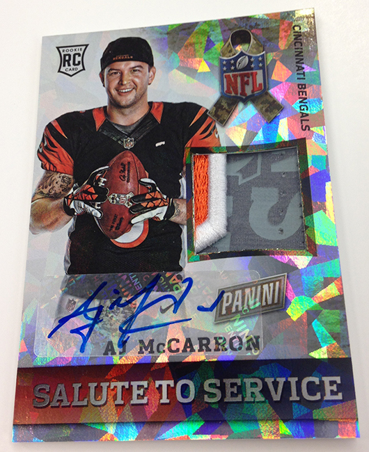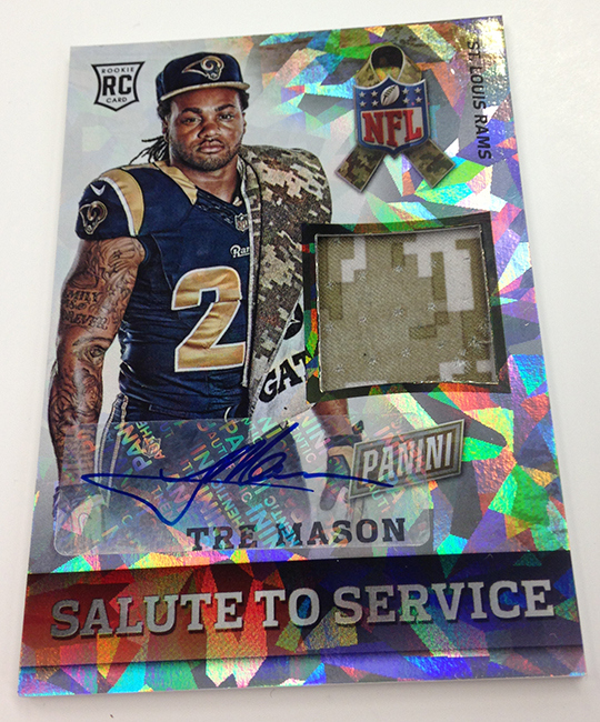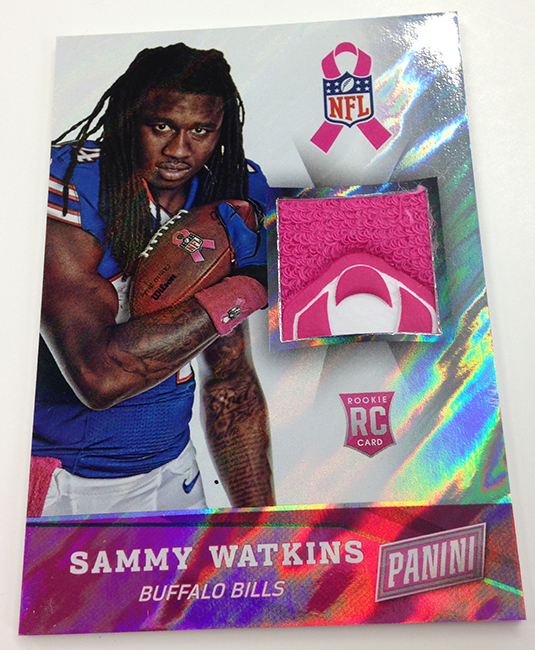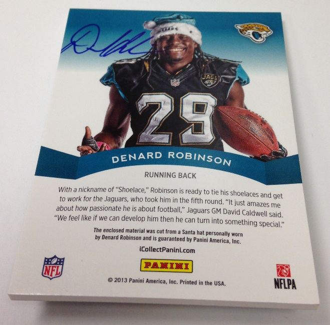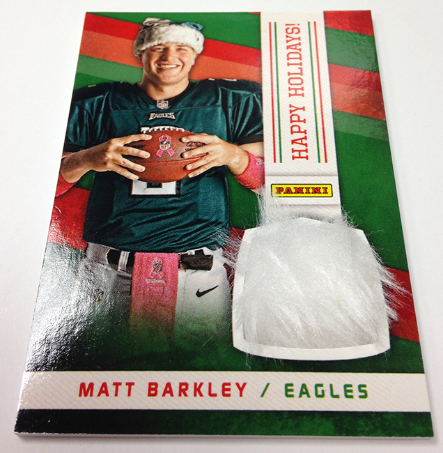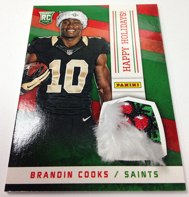 The memorabilia card program is loaded up with compelling content that focuses on the NBA’s brightest rookies along with cards looking at NFL initiatives such as Breast Cancer Awareness and Salute to Service. As expected, there will also be some Happy Holidays memorabilia cards of players wearing Santa Claus hats – a Panini tradition.