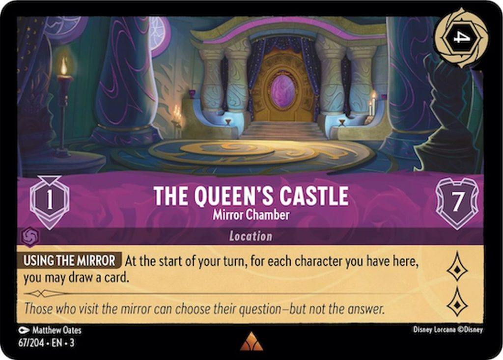 The Queen’s Castle is a location card with seven Willpower and a Move Cost of just one Ink, and it shines with its Using the Mirror ability. For each character a player has at The Queen’s Castle, they can draw a card at the start of their turn.