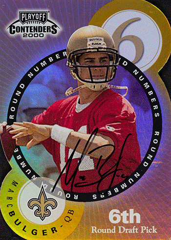If this card is any indication of the expectations for Tom Brady, it shows that they weren’t very high. He’s not only sharing the card with Marc Bulger, a solid but not spectacular QB, but Brady’s found on the back.