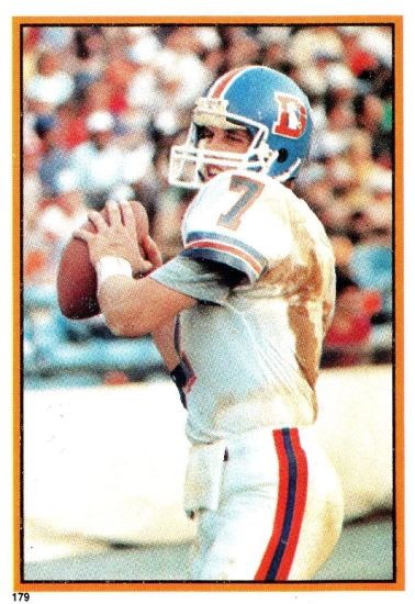 Value wise, the 1989 Panini Stickers UK #263 John Elway ($50 Mint) is where the chase is at. For those of us in the US, 1989 Panini Stickers #263 John Elway is more common and far less valuable ($5 Mint).