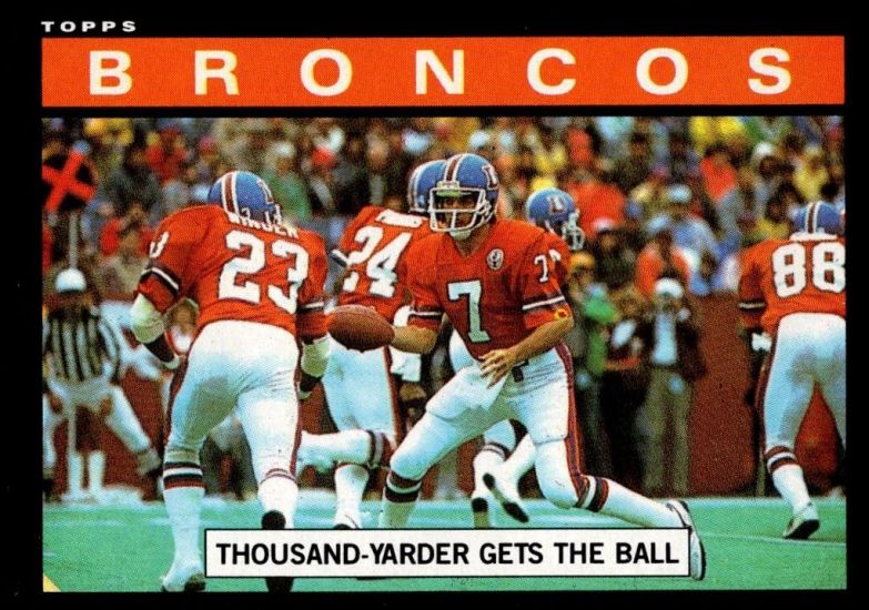 Topps is the only game in town, again, in 1985 with stickers (#24), 1985 Topps Coming Soon Stickers #24, Topps Glossy Inserts #3, and 1985 Topps #235 Denver Broncos Team Leaders featuring Sammy Winder with Elway handing off to him. The Wilder Team Leaders cards can easily be found between $1-2 on secondary sales platforms.