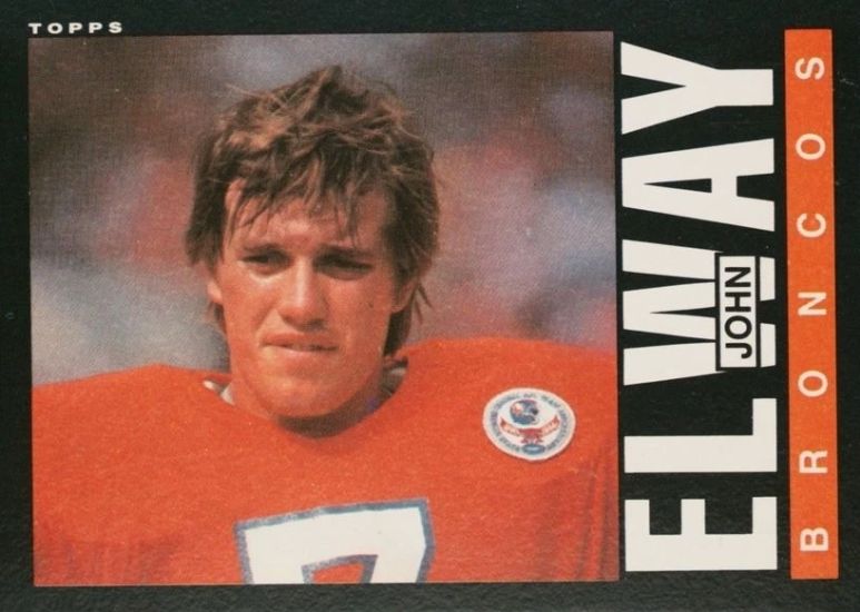 The other horizontal card with a vertical name plate is the 1985 Topps #238 John Elway. The second-year card of the Hall of Famer can bring in $25 Mint.