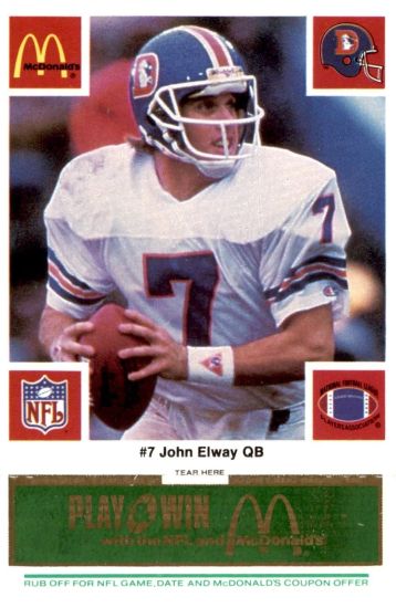 If you like product placements on your cards and/or love McDonald’s, the 1986 McDonald’s Broncos Green Tab #7 John Elway DP is for you (Mint $15).