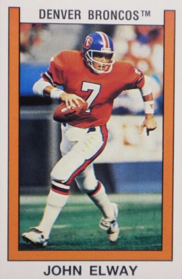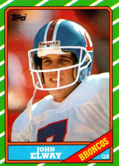The 1986 Topps set is distinctive, good or bad, with the white and green stripes along the border, representing a football field. Mint values for the #112 Elway are around $12.