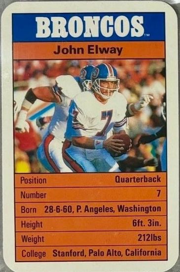 The headliner for collectors in the 1987 niche: 1987 Broncos Ace Fact Pack #4 John Elway. Mint values per the OPG are around $400. The 33-card set features 22 players and 11 team cards. Made in Germany by Ace Fact Pack and distributed in England, Ace Fact Packs are hard to come by in the states.