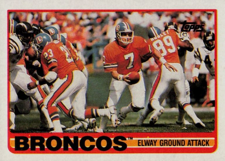When Fleer jumped into the football pool in 1986, Elway didn’t have his own card – no player did. The set consisted of 88 cards title “Live Action Football.” Each team were covered by three cards – “On Offense,” “On Defense,” and “In Action.” A 1986 Fleer Team Action #19 Denver Broncos card can bring $12 Mint.