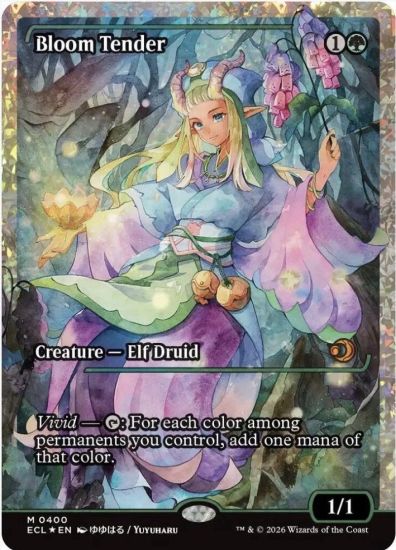 In 2008, the Elf Druid Bloom Tender made a first appearance with subsequent cards released in 2019, 2021, 2022, 2024, and in 2026. Because Bloom Tender can generate up to five different colors of mana if you control permanents of all five colors, this is a powerful card on the tabletop for multicolored decks.